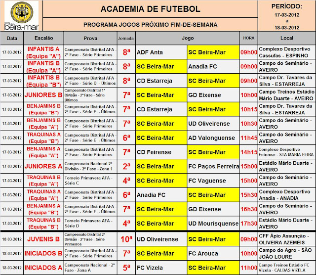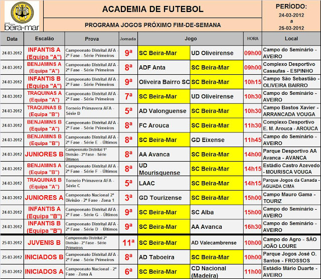 De visita a Estarreja estão infantis B e benjamins B e, em ambos os escalões, o nosso adversário é claramente favorito. Jogo mais equilibrado e de desfecho mais incerto será o que oporá, no campo do Seminário, o Beira-Mar ao Valonguense, no escalão de traquinas A.