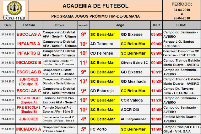 ESCOLAS A: Saída difícil para a equipa do Beira-Mar, no início da 2ª volta da 2ª fase do campeonato distrital. Os auri-negros, actualmente no 2º lugar da série F, defrontam o Azurva, que se posiciona no posto imediatamente a seguir, apenas a 3 pontos dos aveirenses. Prevê-se, pois, um jogo mais equilibrado do que os últimos disputados pela equipa dos irmãos Teles, mas, por isso mesmo, também mais aliciante para os atletas que o disputarem que, seguramente, saborearão melhor a vitória que se espera.